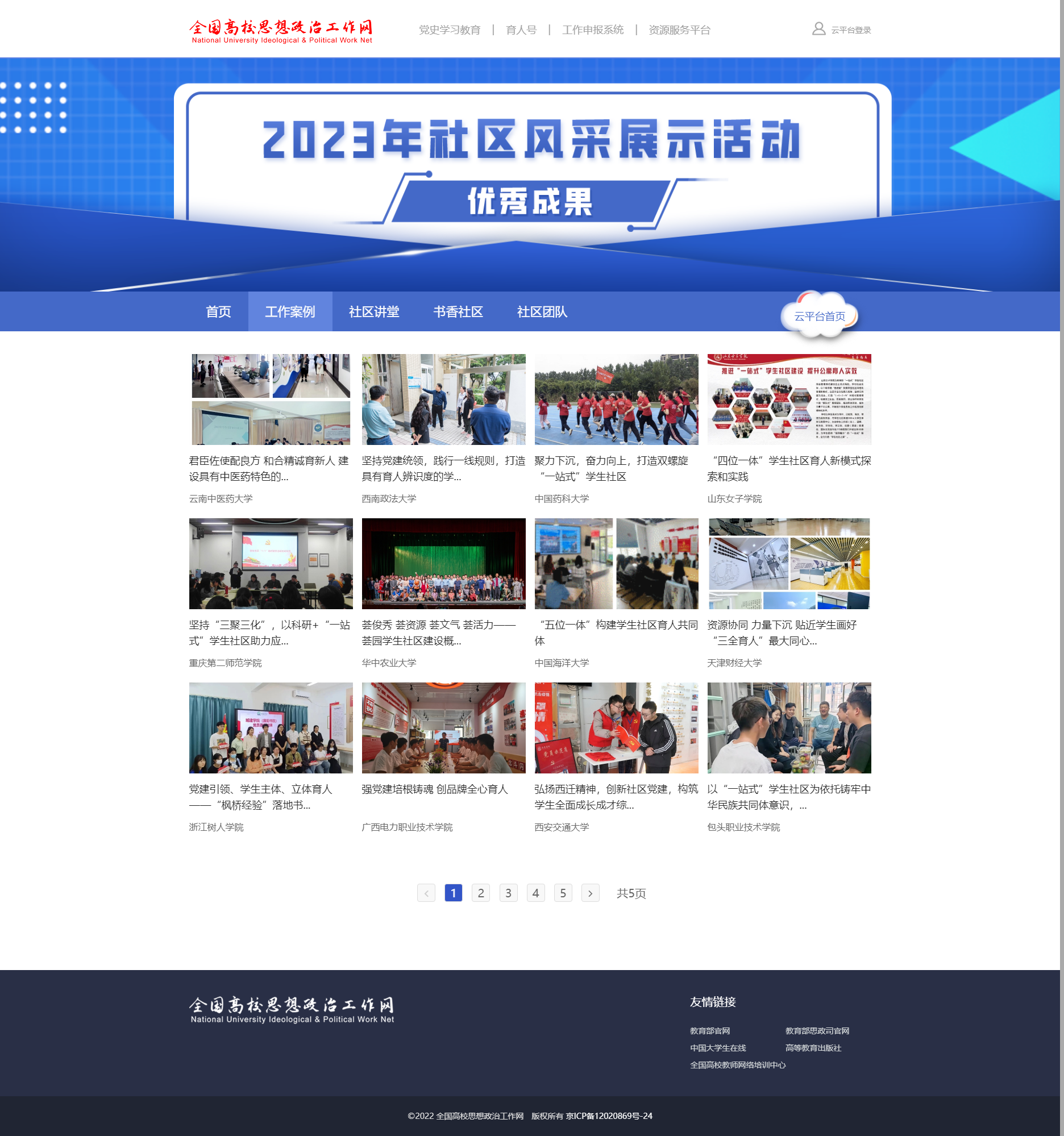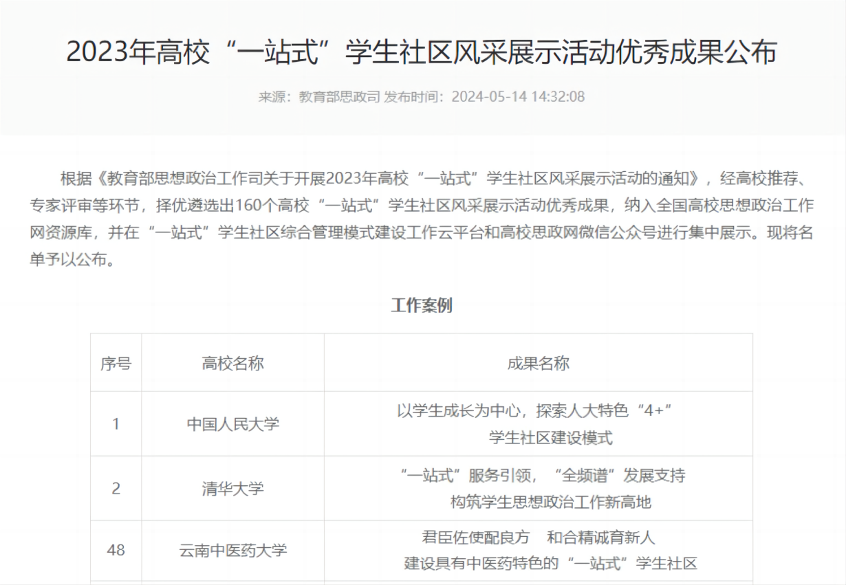 近日,教育部思想政治工作司公布2023年高校“一站式”学生社区风采展示活动优秀成果。经过自主展示、集中申报、专家遴选等环节,我校报送的工作案例《君臣佐使配良方、和合精诚育新人,建设具有中医药特色的“一站式”学生社区》获评高校“一站式”学生社区风采展示活动优秀成果(全国50项),被纳入全国高校思想政治工作网资源库,并在“一站式”学生社区综合管理模式建设工作云平台及高校思政网微信公众号进行集中展示。