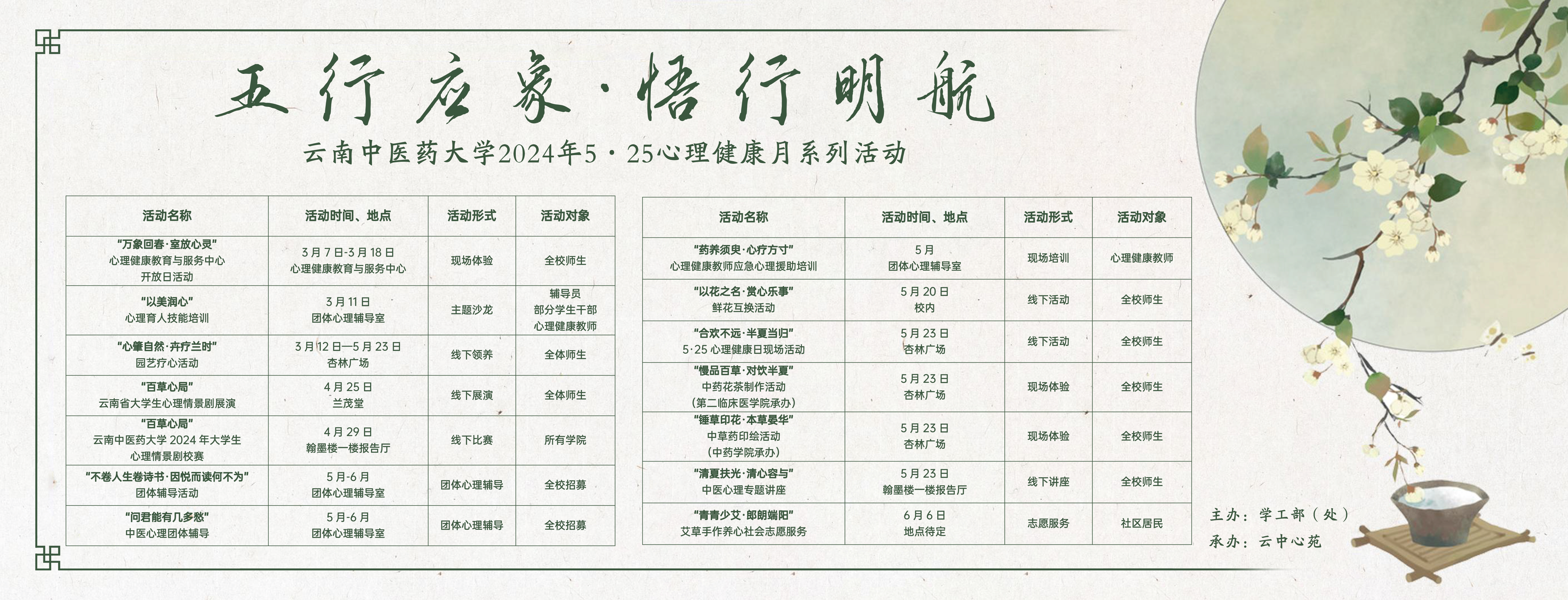 “五行应象·悟行明航”5·25心理健康月系列活动从3月启动,持续3个月,开展了形式多样的活动10余场,营造了“以文化人,以心育人”的校园育心工作氛围。