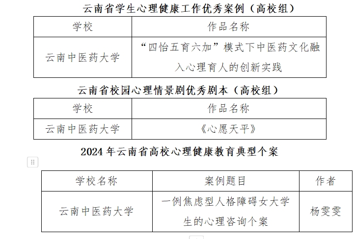 近日,接省委教育工委通知,我校选送的3项作品在2024年云南省学生心理健康宣传教育月活动中均获奖。