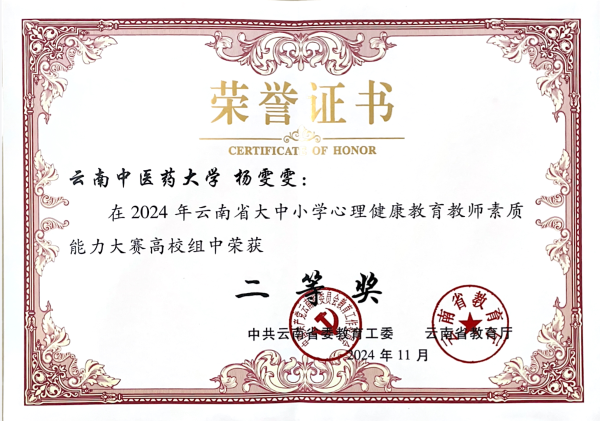 11月1日,由中共云南省委教育工委、云南省教育厅主办的2024年云南省大中小学心理健康教育教师素质能力大赛在昆明冶金高等专科学校举行。我校心理健康教育与服务中心专职教师杨雯雯荣获高校组二等奖。