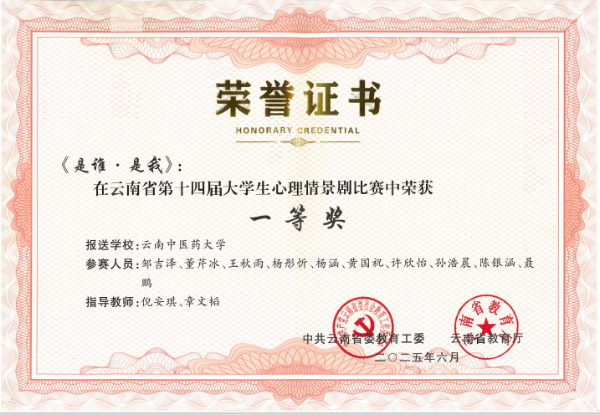 近年来,在学校党委行政的高度重视下,我校心理育人工作成效显著。心理健康教育与服务中心在打造中医药心理健康教育品牌上精准发力,依托学科专业特色、发挥中医中药文化优势,稳扎稳打办好校赛,精心组织筹备省赛,三年两度荣获全省第一名,探索出一条融“心理健康+中医文化+表达性治疗”为一体的心理剧疗愈形式,提升心理情景剧在大学生心理健康教育中的有效性,持续输出云中心理健康正能量。