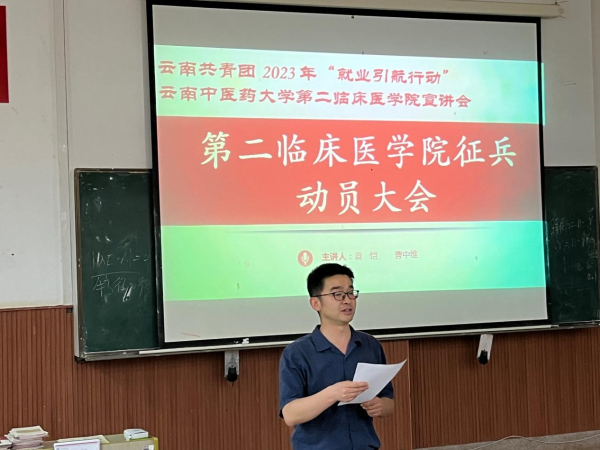 为提升学院学生参军入伍积极性,引导毕业生走入军营。5月26日,第二临床医学院在呈贡校区召开征兵入伍动员大会。院长袁恺、学生党总支书记王丽娟、辅导员李昊、王联东、学生处武装部曹中维、征兵宣讲团成员黄培琳、以及2023届、2024届符合征兵入伍条件的男生参加会议,会议由学工办李胜男主持。