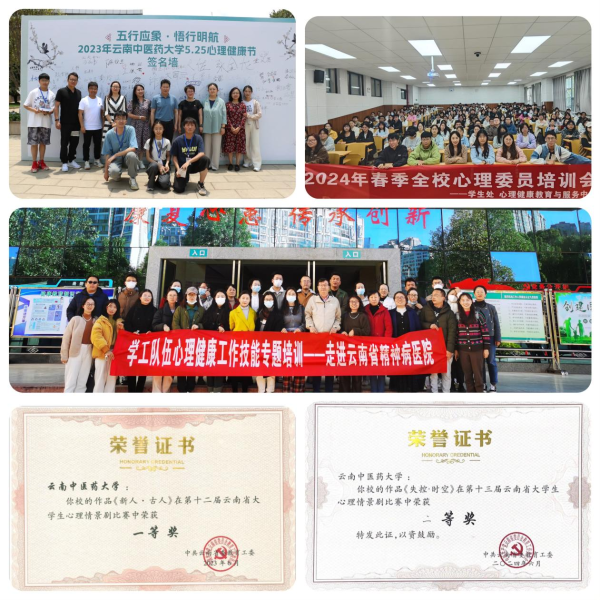 围绕“五季、五脏、五色、五味、五音”中医理论,建设具有中医药特色的心理健康教育品牌。持续开展5·25心理健康教育月、10·10世界精神卫生日系列活动及中医心理特色团体辅导,提升大学生心理健康素养。选送的心理剧《新人·古人》《失控·时空》分获第十二届云南省大学生心理情景剧一等奖、十三届云南省大学生心理情景剧二等奖。