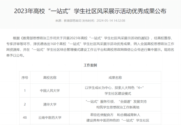 在学校高位推动下,重点对主城区校舍长期以来存在的住宿拥挤、安全隐患等问题进行综合整治,极大改善学生住宿条件。健全“1中心+5平台”工作机制,加快推进“数字学工”信息化系统建设。“云中和合‘一站式’学生社区”项目被列为全省高校首批试点,连续2年被评为A级。呈贡校区二期学生社区建成2500㎡共计40个学生活动功能房,党建、管理、服务、教育力量全面下沉学生一线。工作案例《君臣佐使配良方、和合精诚育新人,建设具有中医药特色的“一站式”学生社区》获评高校“一站式”学生社区风采展示活动优秀成果,从政策导向、工作体系、资源配置、条件保障上全方位发力,形成学校搭台、学院唱戏、校企共建、师生共赢的生动局面。