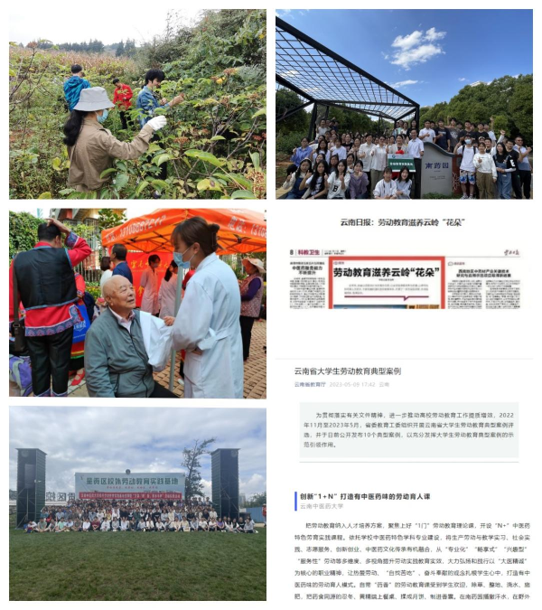 制定“专业化”劳动教育实施方案,打造有中医药味的劳动育人模式。组织“劳动教育月”“劳动教育周”活动,挂牌27家校内外劳动教育实践基地。通过在校内外实践基地开展中药材种植、爱心义诊、传统美食制作、田间劳作等活动,将劳动教育融入医教协同、校地共建,大力弘扬和践行以“大医精诚”为核心的职业精神,让热爱劳动、“自找苦吃”、奋斗奉献的观念扎根学生心中。劳动案例《“1+N”模式创新中医药院校劳动教育路径》获云南省大学生劳动教育十大典型案例。