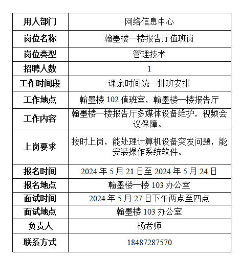 3、用工部门组织招聘,招聘结束后将拟录用学生的《申请表》交学生处。