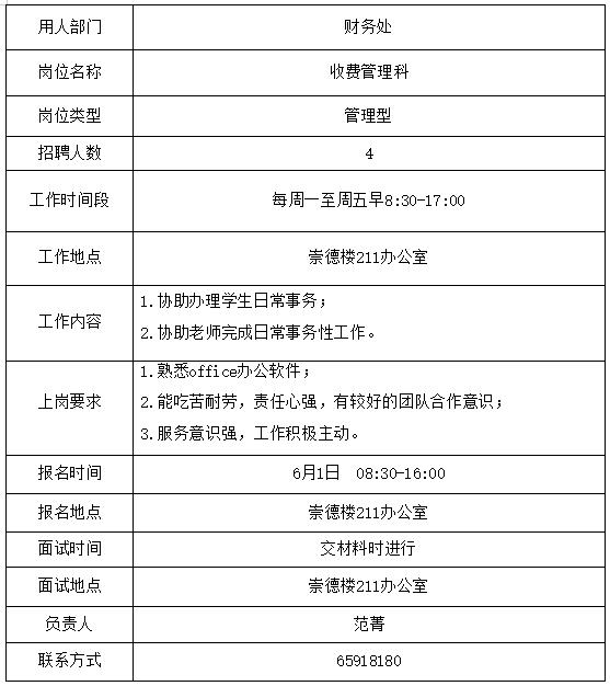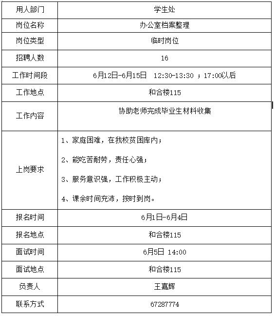 3、用工部门组织招聘,招聘结束后将拟录用学生的《申请表》交学生处。