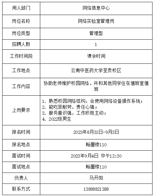 云南中医药大学2023学年秋季学期勤工助学固定岗位招聘公告(第二批)