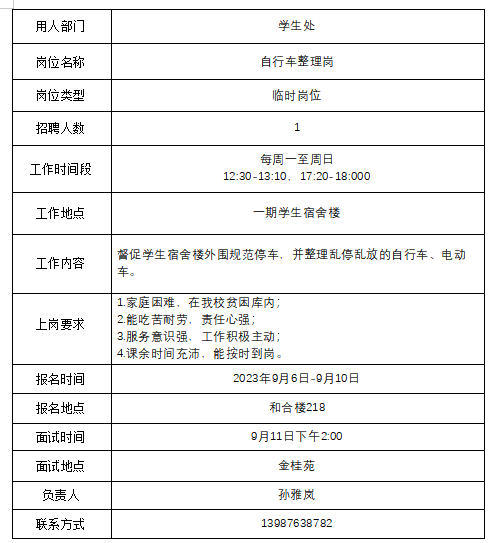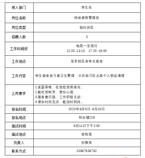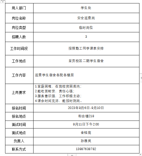 3、用工部门组织招聘,招聘结束后将拟录用学生的《申请表》交学生处。