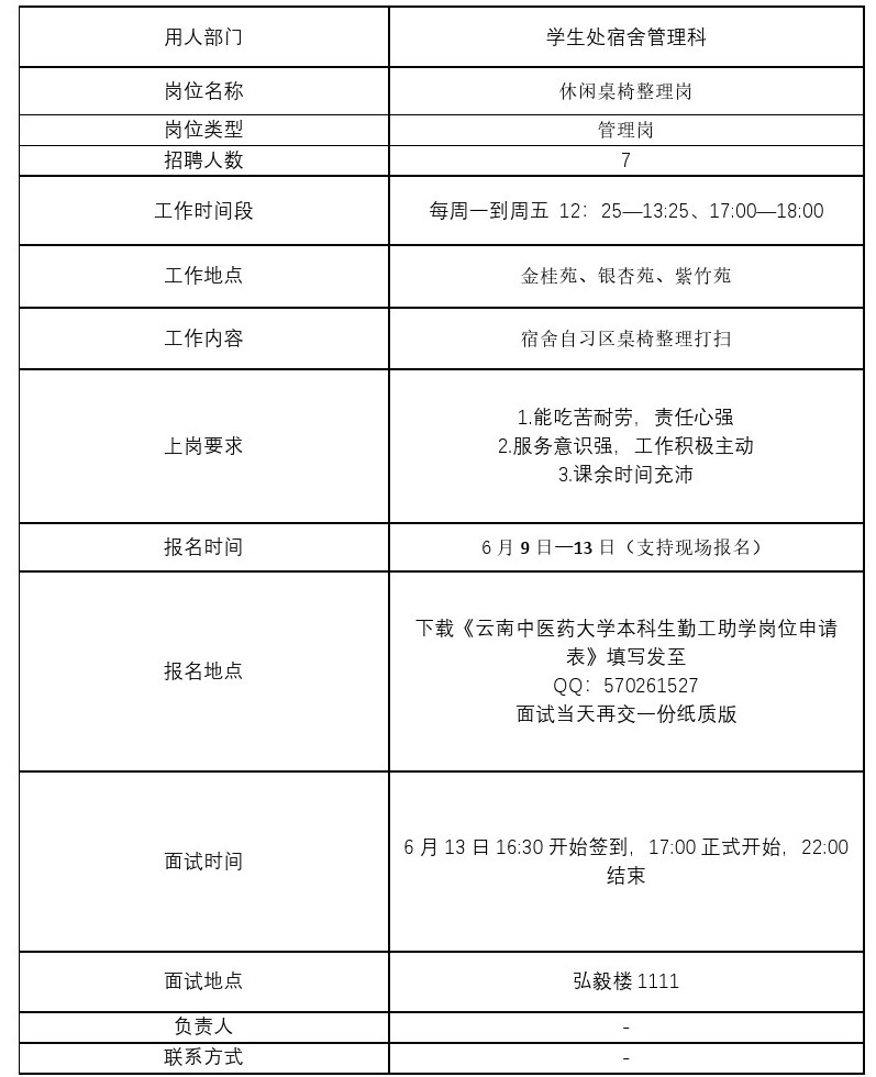 2、申请人持已核实过的《云南中医药大学本科生勤工助学岗位申请表》按照招聘信息的要求到各用工部门进行应聘。