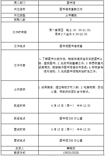 3、用工部门组织招聘,招聘结束后将拟录用学生的《申请表》交学生处。
