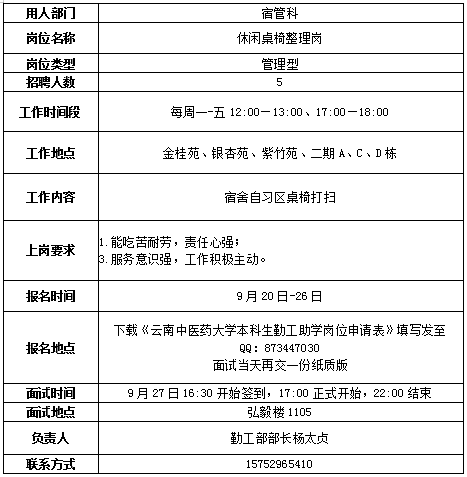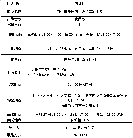 2、申请人持已核实过的《云南中医药大学本科生勤工助学岗位申请表》按照招聘信息的要求到各用工部门进行应聘。